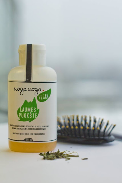 Iki šiol nebuvau bandžiusi jokio Uoga Uoga produkto plaukams. Todėl besibaigiant šampūnui, ranka tiesėsi prie Uoga Uoga "Laumės paukštės"šampūno, skirto normaliems plaukams. Kaip visada - skambi antraštė ir daug žadantis aprašymas patraukė akį.